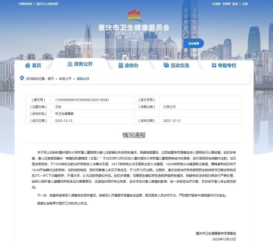 经初步核查老钱庄,患儿马某某因确诊“脊髓性肌萎缩症(Ⅱ型)”于2025年12月9日收入重庆医科大学附属儿童医院神经内科病房,进行诺西那生钠鞘内注射。当日医生取药后,于13:54将拟注射治疗药物放入冰箱冷冻层,14:17将药物从冷冻层取出放入冷藏层,14:24将药物从冷藏层取出复温,腰椎穿刺成功后于14:34开始鞘内注射药物,注射完药物后,同时观察患儿未见不良反应,于12月10日出院。